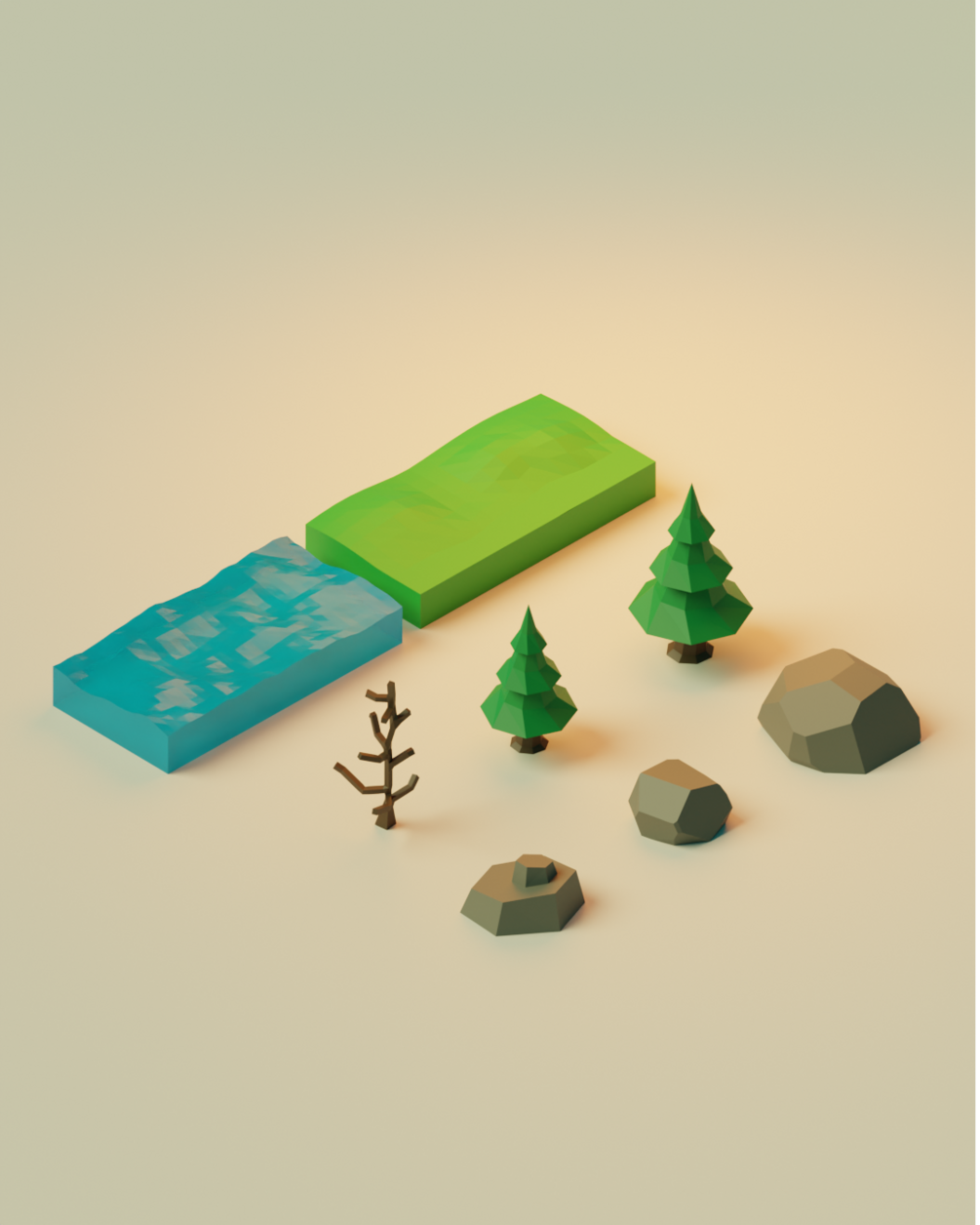 This pack includes a small set of low poly forest assets: trees, rocks, a bare tree, a grass tile, and a water tile. All models are lightweight and game ready, suitable for use in Unity, Unreal, Godot, or Blender.